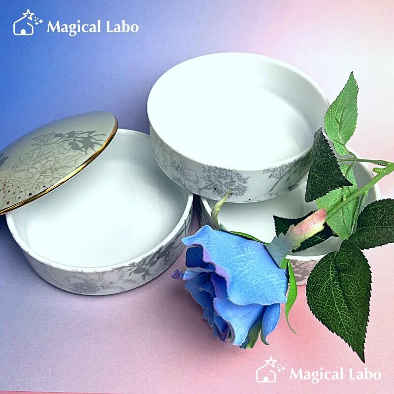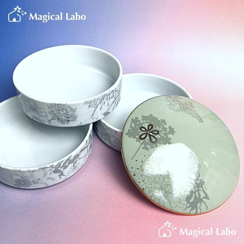 ホワイト&モノトーンの花柄をベースに、蓋にはグリー系で落ち着いた薄緑を使用しました。