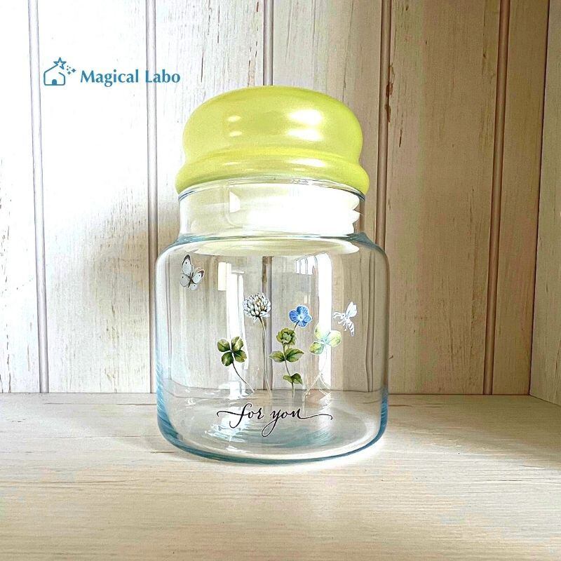 ガラス瓶本体にはクローバー柄のプリントを全面に入れています。
