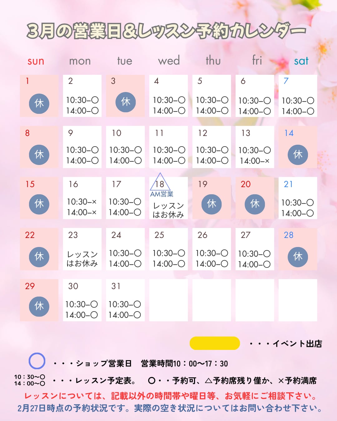 ※営業日及びレッスンの日程やお時間が変更になる場合がございます。